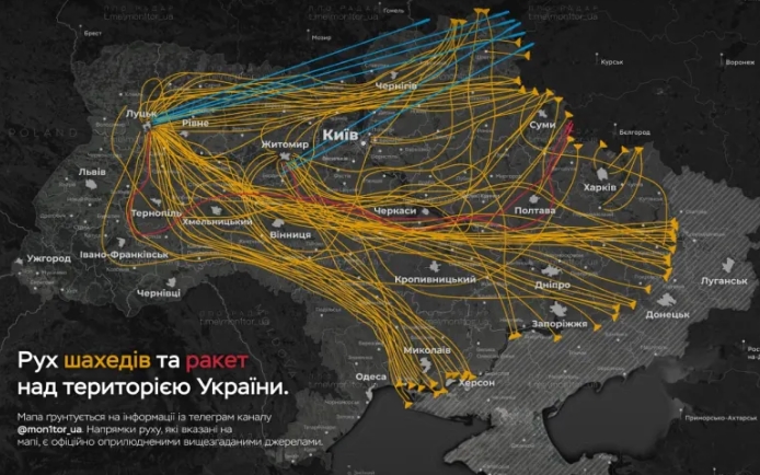 O hartă publicată pe platforme de socializare arată că dronele au pătruns în spațiul aerian ucrainean din multiple direcții, inclusiv din sud-est, est și nord-est. În schimb, rachetele hipersonice Kinjal au fost lansate dinspre nord-vest, de pe teritoriul Rusiei.